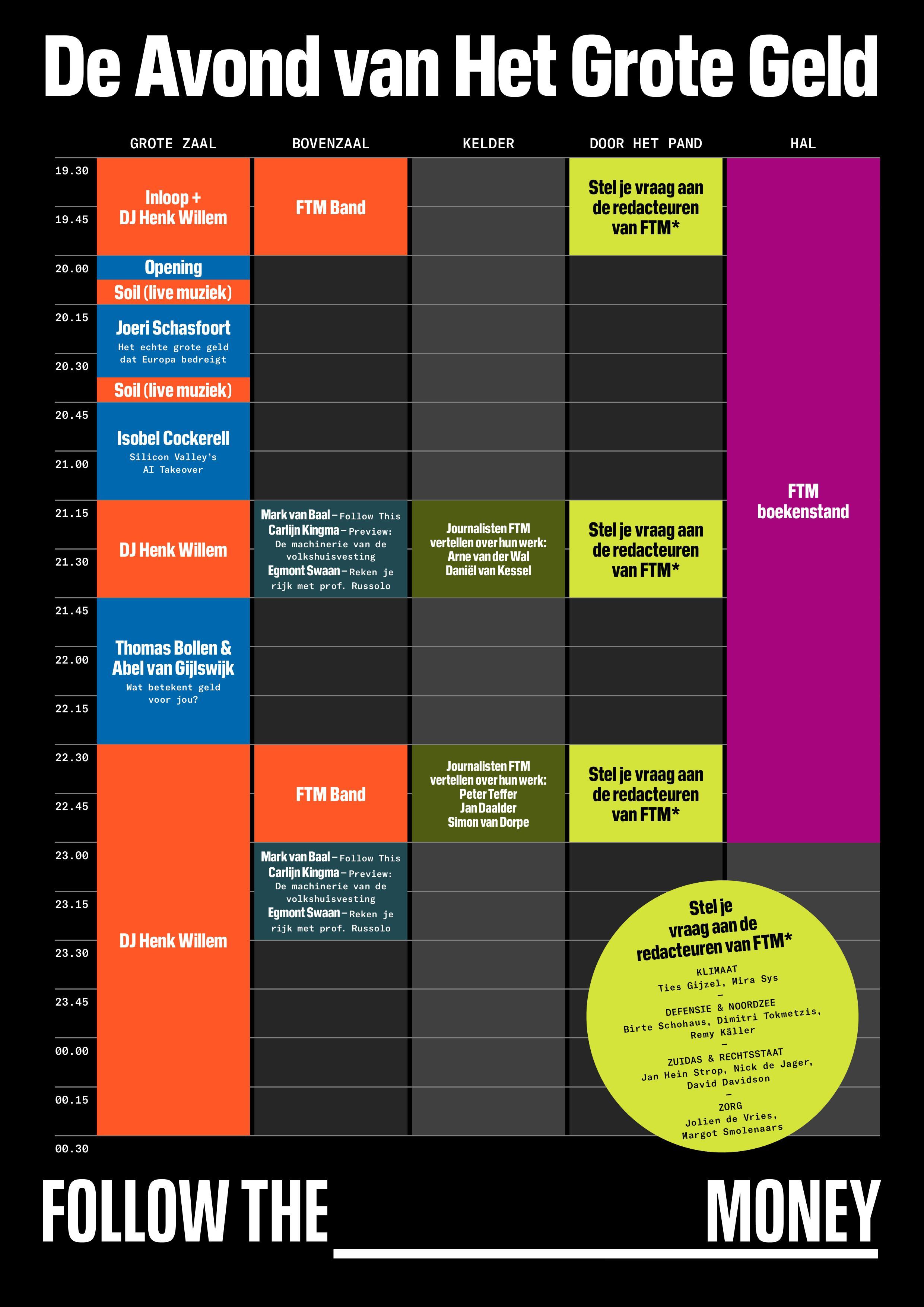 In de Grote Zaal staat het grote geld en de mondiale machtsstructuur centraal. Econoom Joeri Schasfoort van YouTube-kanaal Money&Macro vertelt waar het echt grote geld zich bevindt. Abel van Gijlswijk (frontman van Hang Youth en schrijver) gaat in gesprek met FTM-journalist Thomas Bollen over zijn reis van crypto-belegger naar anti-kapitalist, en over zijn persoonlijke relatie met geld. Daarnaast spreekt techjournalist Isobel Cockerell (Coda Story, New York) over de ongekende macht van techbedrijven.